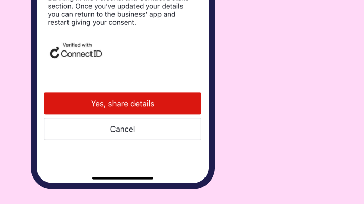 Review the details, then confirm by selecting ‘Yes, share details’ and your personal details will be shared securely via ConnectID.