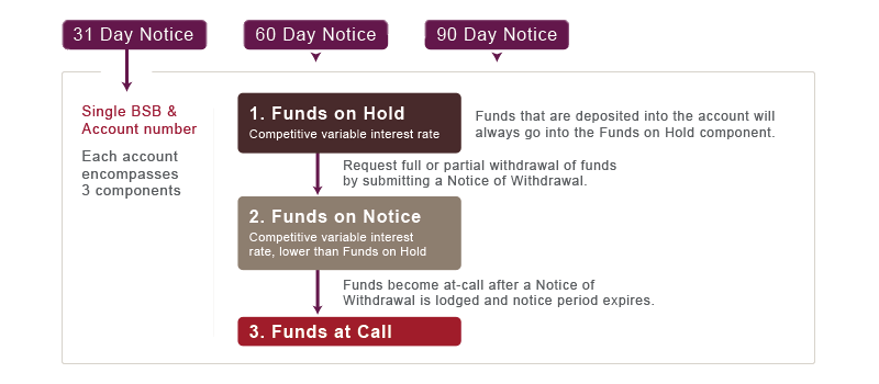 Funds deposited into this account will automatically be placed in Funds on Hold and can only be accessed once a Notice of Withdrawal has been issued and the relevant notice period has been served. You cannot withdraw funds early or break a notice period, unless we determine you are in financial hardship.