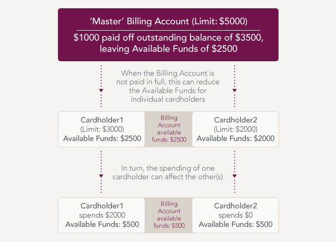 You will allocate each cardholder an individual credit limit. The combined credit limit must not exceed the total limit of the facility. At the end of the statement cycle the closing balance of each card is swept up into the Billing Account. One payment is then required to be made to the Billing Account, by the payment due date.