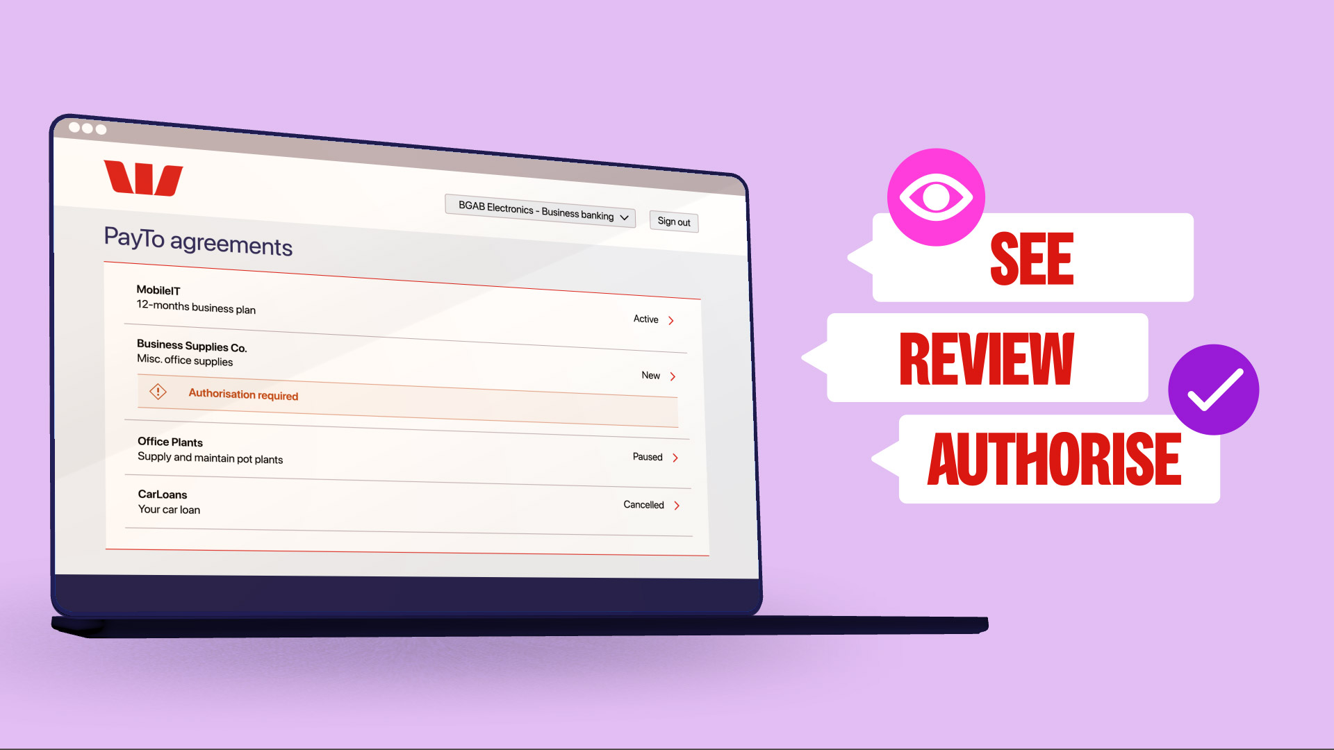All new PayTo agreements need to be authorised by you in Online Banking or the Westpac App before a business can take a payment.