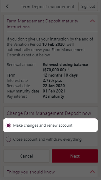 • Not available for customers who are not able to open or renew digitally (e.g., some joint accounts), Financial Institutions, Institutional Bank customers, Farm Management Deposits and Term Deposits held as security.