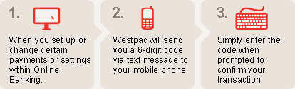 We have a safeguard against fraud for personal customers. Westpac Protect™ Security Code uses a one-off code via notification from the App or as an SMS to your mobile phone to confirm certain transactions via text message when banking online.