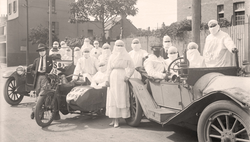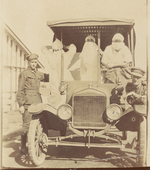 An ambulance with nurses protected with masks against Spanish flu at the Randwick Military Hospital, 1919. (Australian War Memorial)
