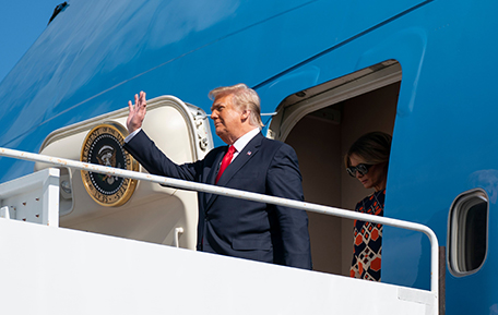 Former US President Donald Trump waves as he steps off Air Force One in Florida on January 20. (Getty)