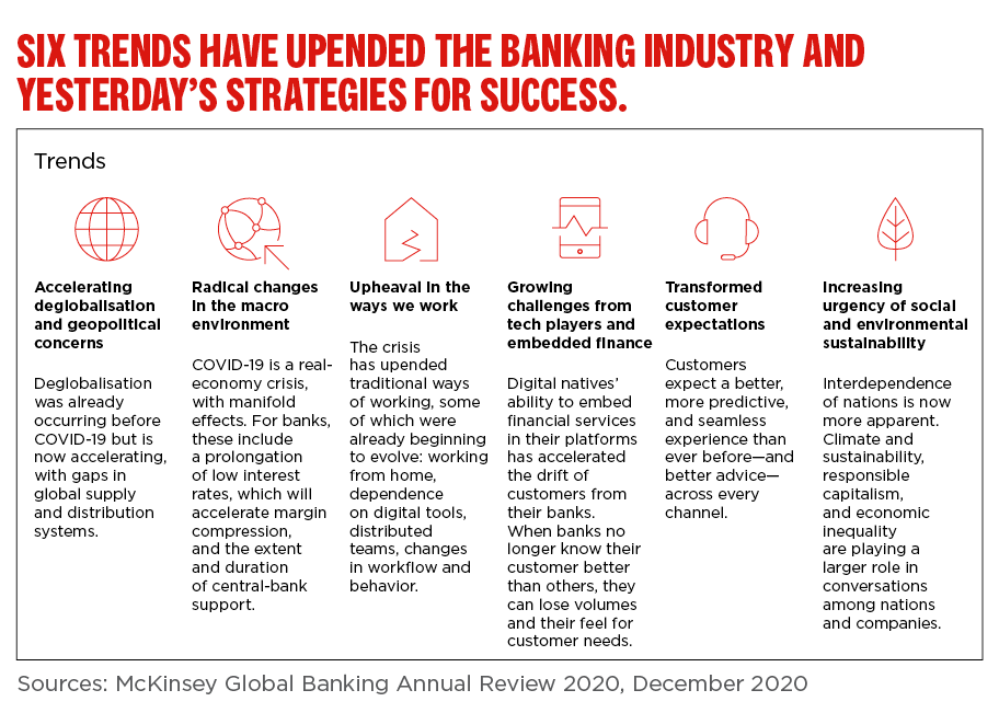 To ensure they "not only survive but arrive in style ahead of their rivals", McKinsey says banks should prioritise action across three areas: “muscle” (the way they get things done), “bones” (the way they are structured), and “spirit” (their reason for being). This includes entrenching the heightened focus on customers during COVID and reinventing their business models, including by partnering with and embedding themselves in the “platforms and ecosystems challenging them”.
