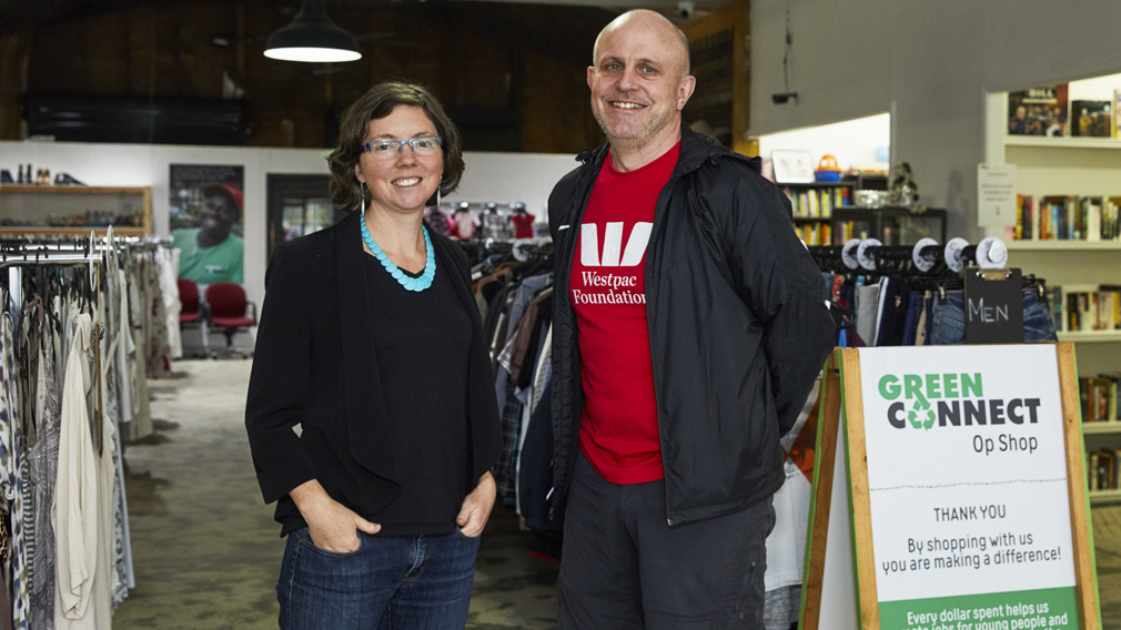 Westpac employee Jayson Bricknell (right) who volunteers his skills to Kylie Flament (left), general manager of social enterprise Green Connect. (Flashpoint Labs)