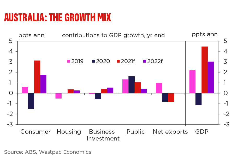 Cashed up consumers are set to drive the economy this year, buoyed by the strong housing market, jobs market and the national border remaining shut (in 2019 Australians spent around $55bn on holidays overseas, well above the $25bn foreign tourists spent in Australia).