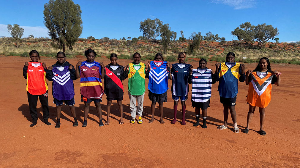 Participants show off their new team guernseys (teams from left): Yulara, Irrunytju, Kiwirrkurra, Amata, Papunya, Ntaria, Mimili, Mutijulu, Kalukatjara, Imanpa. (Natalie Dyson)