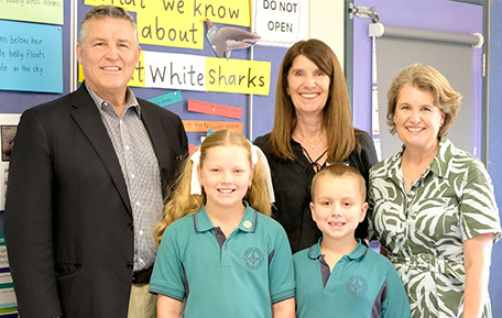 This week, Westpac CEO Anthony Miller returned to Dubbo, where his education began. Pictured: Anthony Miller (left); Annie Munro, Orana Heights Principal (centre), Sherril Nixon, CEO, Schools Plus (right) and students Maisy and Henry.