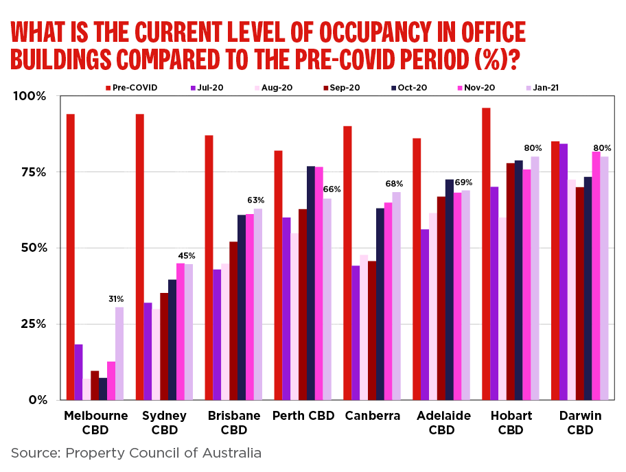 The findings come as new data from the Property Council of Australia showed office workers continue their gradual return to CBDs last month, led by a sharp jump in Melbourne to 31 per cent occupancy in the week after Australia Day. Despite the Northern Beaches lockdown, Sydney also improved on pre-Christmas occupancy levels to 45 per cent in January. Hobart and Darwin led at 80 per cent.