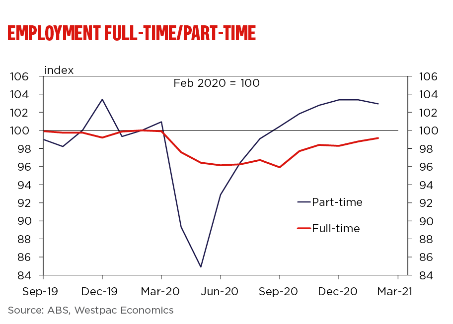 He says the “political and economic incentives” are strong enough to see around $50bn in discretionary spending announced over the forward estimates, but warns that households shouldn’t expect the same support as in last year’s crisis-orientated budget following the strong gains across the labour market. Remarkably, total employment is above pre-COVID levels.
