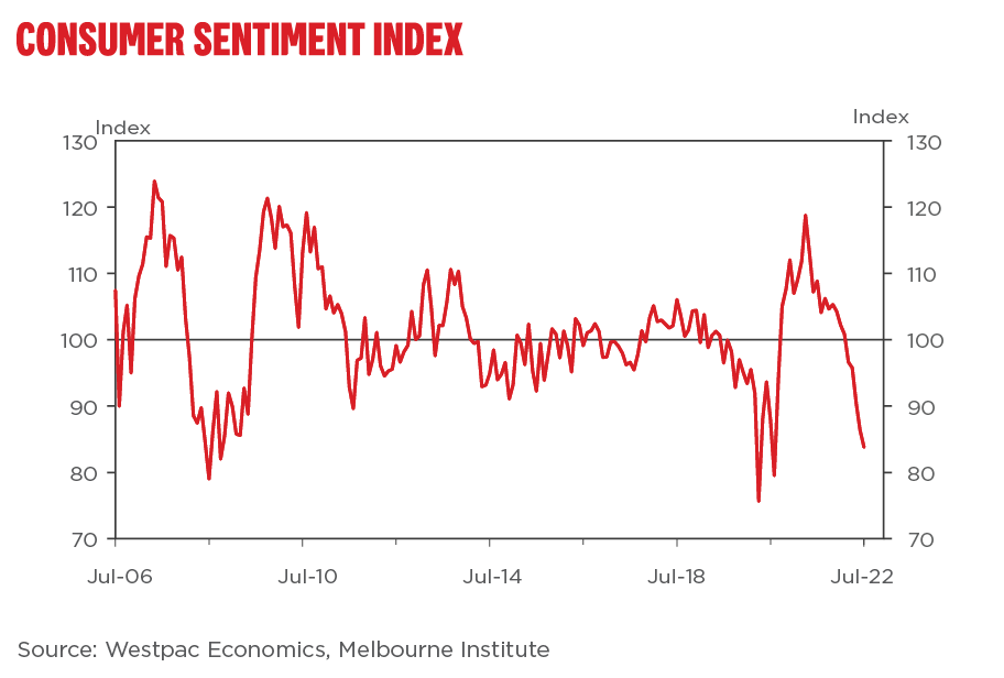 The Westpac-Melbourne Institute Index of Consumer Sentiment fell a further 3 per cent in July to 83.8 - the seventh consecutive monthly decline - as the impact from higher interest rates and surging inflation took its toll on households.