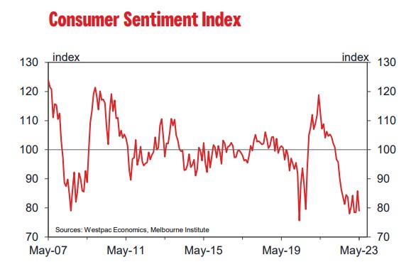 The Westpac Melbourne Institute Consumer Sentiment Index fell by 7.9 per cent to 79.0 in May from 85.8 in April.