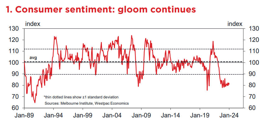 The Westpac–Melbourne Institute Consumer Sentiment Index remains stuck at very weak levels, running around 20 per cent below its long-term average as cost-of-living pressures continue to dominate.