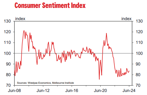 The Westpac Melbourne Institute consumer sentiment index rose 1.7 per cent to 83.6 in June, remaining in deeply pessimistic territory.