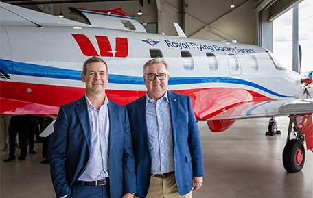 Westpac Chief Executive, Business and Wealth, Paul Fowler (left) and RFDS SA/NT Chair Peter de Cure (right) in front of the RFDS’s next‑generation aircraft, the PC-12 PRO.