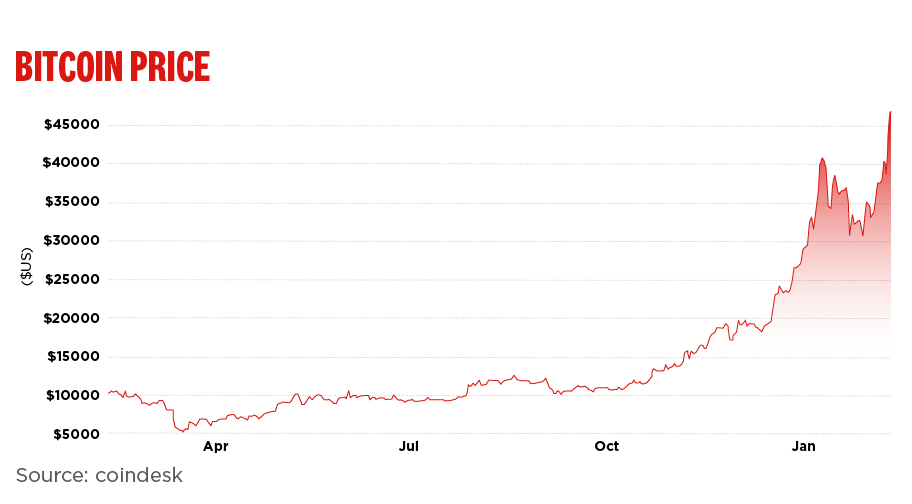 The price of bitcoin, the most popular among thousands of cryptos, has soared almost 400 per cent over the last 12 months as it attracted more interest from large investors. This week, bitcoin surpassed $US47,000 ($61,000) after it emerged Elon Musk’s Tesla had made become the latest corporate to dive in with a $US1.5 billion investment.