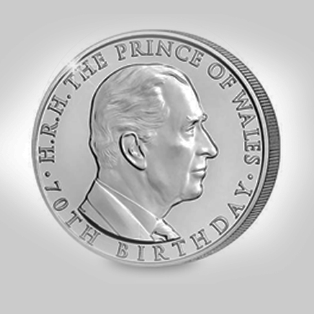 A coin released by the UK’s Royal Mint in 2018 commemorating Charles’ 70th birthday. (The Westminster Collection)