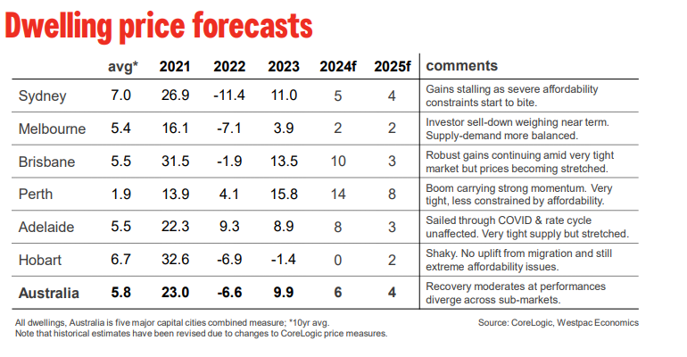 Westpac economists are sticking with their forecast for dwelling prices to rise by 6 per cent nationally this year, followed by 4 per cent in 2025, easing from 10 per cent growth in 2023.