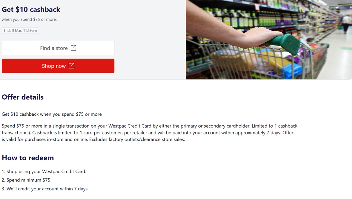 If you see a cashback offer you like, you’ll need to meet the minimum spend requirements and number of transactions required at the featured store between 12:00AM AEST on the Start date and 11:59PM AEST on the End date to qualify for a cashback on your card.