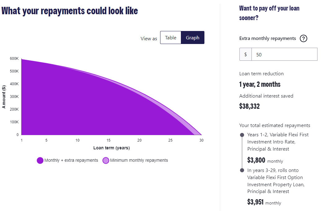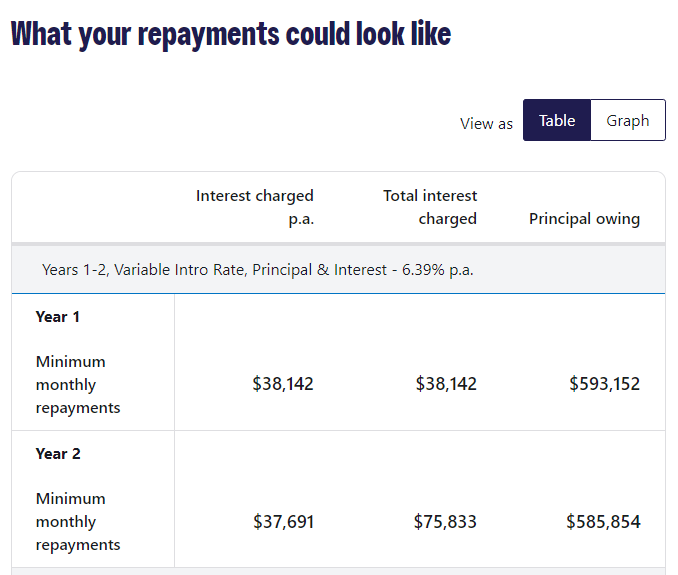 The section below the repayments calculator shows how your loan is paid off over time, broken down so you can see the full interest costs. There are two options to display this information: