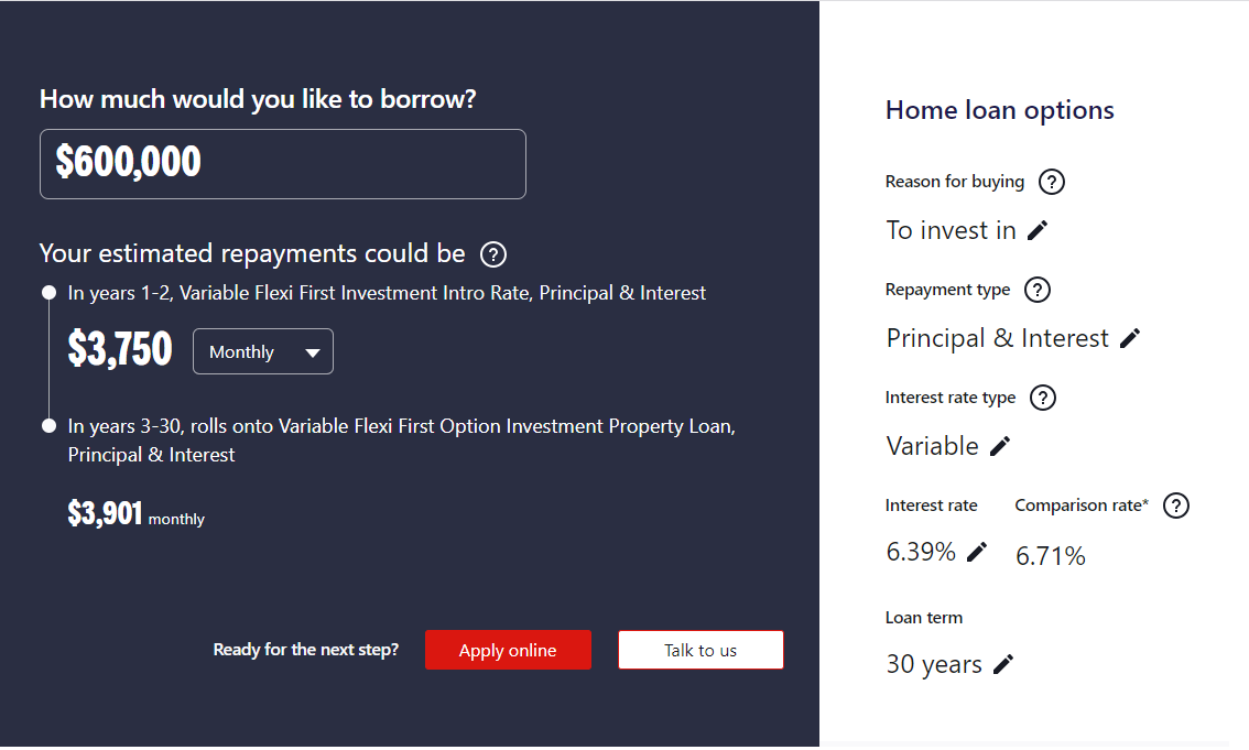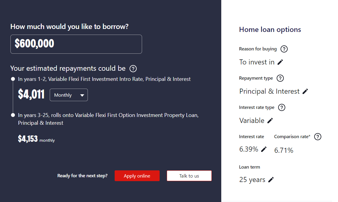 Remember that the online calculator provides estimates of your likely costs. Exact costs, including fees and charges, will be made available to you once you complete a full home loan application.