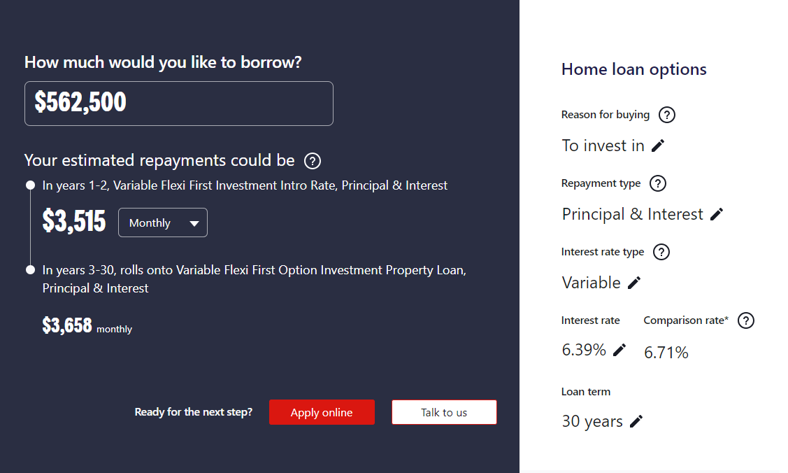 By adjusting the variables, you can see the impact of different changes. For example, if you had a 25% deposit ($187,500), your loan would be $562,500, so your repayments would be lower: