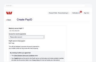 The PayID types available to you may vary depending on your customer profile. If you register your mobile as a PayID, it needs to be the same as your Westpac Protect™ SMS Code.