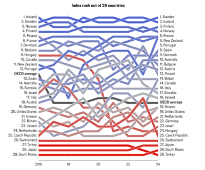 Sweden came in first place, ending Iceland’s two-year winning streak. The Nordics always perform well on our index, which we have published for the past 13 years, thanks to policies that support gender equality and working parents. At the opposite end of the ranking, South Korea—which had always come in last place—advanced to 28th, pushing Turkey down to the bottom spot. New Zealand was our most improved country, rising eight places to fifth.