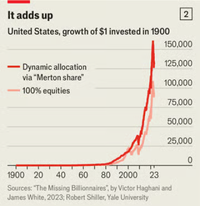 Thankfully, far simpler procedures can produce spectacular results. Our putative 20th-century millionaires just plonked everything in America’s stockmarket, and did very well. Today, we know they could have done even better without much more effort. A simple rule-of-thumb known as the “Merton share” can approximate the optimal split between stocks and inflation-protected government bonds, by comparing their expected returns and volatility.