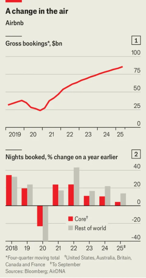 Lately, however, Airbnb’s growth has cooled. The uncertainty wrought by President Donald Trump’s on-and-off tariffs has led consumers to delay booking trips. Policymakers in cities from Paris to New York have implemented restrictions on the platform, which they think contributes to surging house prices. Competition from travel sites such as Booking.com and Expedia is heating up for short-term lets. Web traffic to Airbnb is slowing.