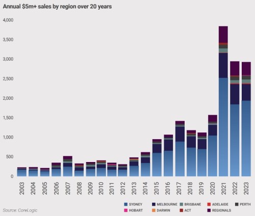 That growth is part of a longer-term trend in which the number of property sales above $5 million has surged 1,151 per cent in the two decades to 2023.