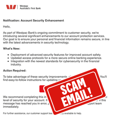 Be aware - The link in this email will take you to a phishing website to capture your personal and banking information. Never use a link received in an email or SMS to sign into your banking. Always type westpac.com.au into your browser, or use the App, to securely access your banking.