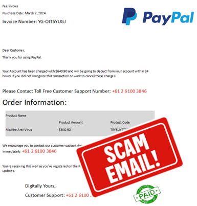 Be aware - The phone number in this email is not listed on PayPal's website as a contact number. To contact PayPal always use the options listed at paypal.com.au/contact-us