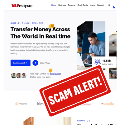 This fake website, visually, uses images and colours that may seem consistent with those you might see on our genuine Westpac website, however it is not legitimate. The information on this site contains details specifically about investing, as well as support services.