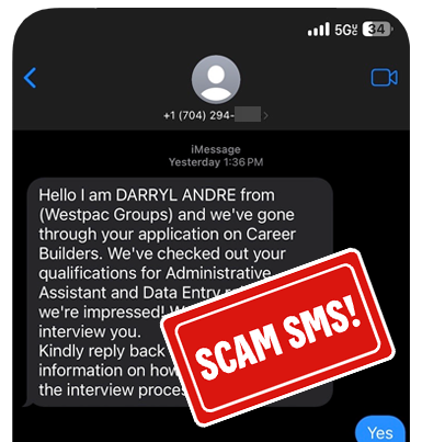 Be aware - These messages are not from a representative of the Westpac Group, rather a scammer attempting to capture your personal and banking information. To learn more about applying for roles at Westpac, visit our Careers information page.