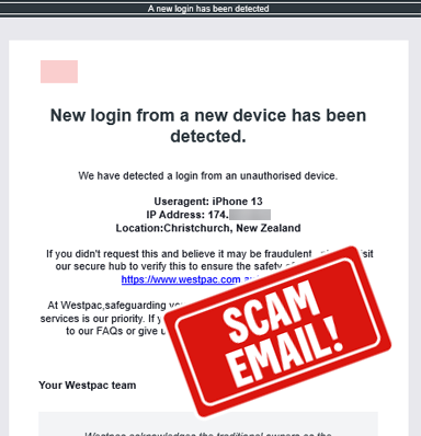 This scam email, claiming to be from Westpac, states we've detected a login from a new device to your Online Banking.